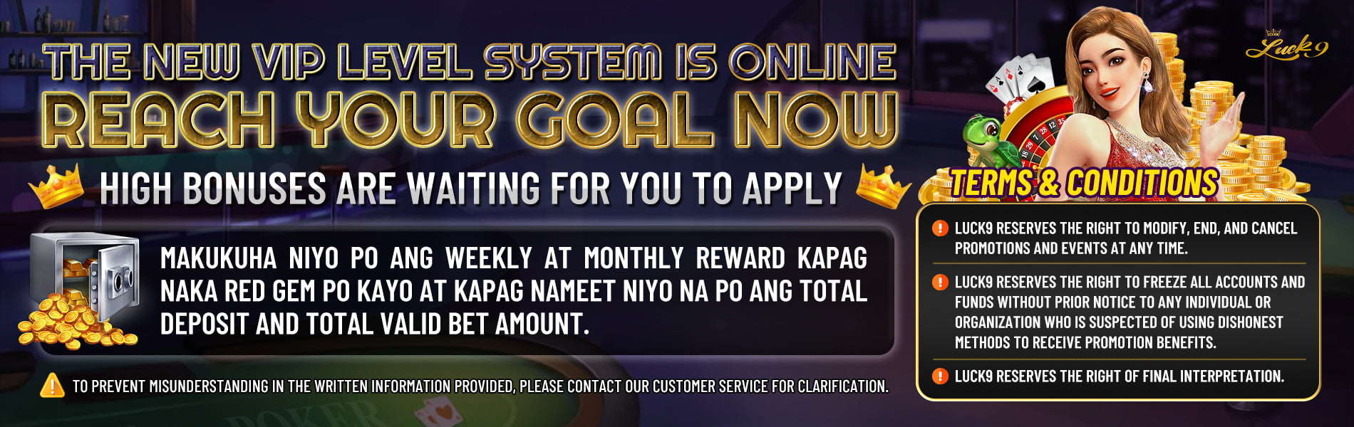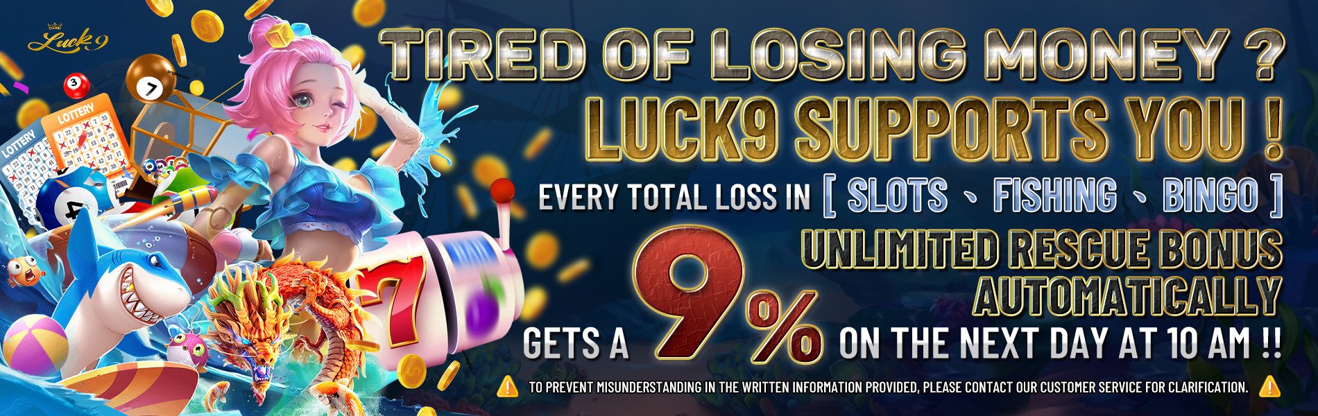 LUCK9 is the most credible and high-quality online casino in the whole Philippines. Besides the fast, safe and stable deposit/withdrawl system, there are also constantly promotional acitivities to give back to our players. Moreover, our 24/7 professional customer service will solve your problems at any time, which make every players enjoy the most honorable and glorious gaming serivice and experiences.